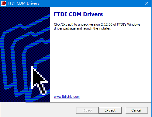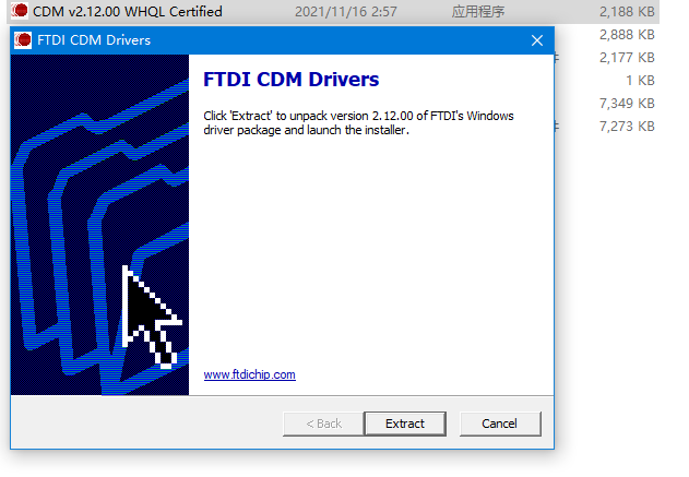下载后解压,并运行CDM v2.23.00 WHQL Certified.ext文件,您将依次看到如下提示,选择Extract, 确定, 运行程序,Extract, 下一页,我接受,下一页,完成
