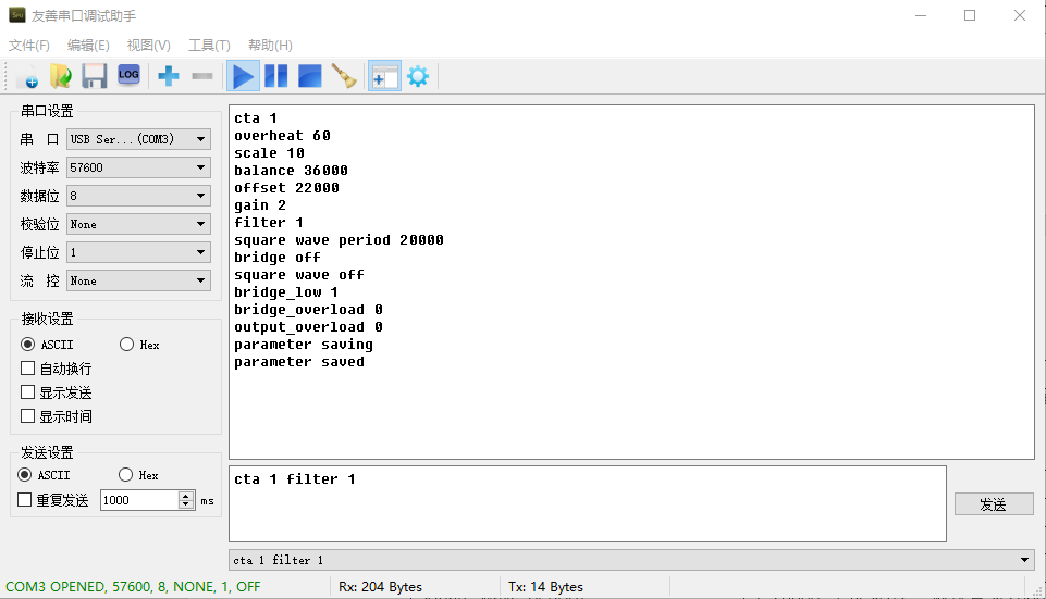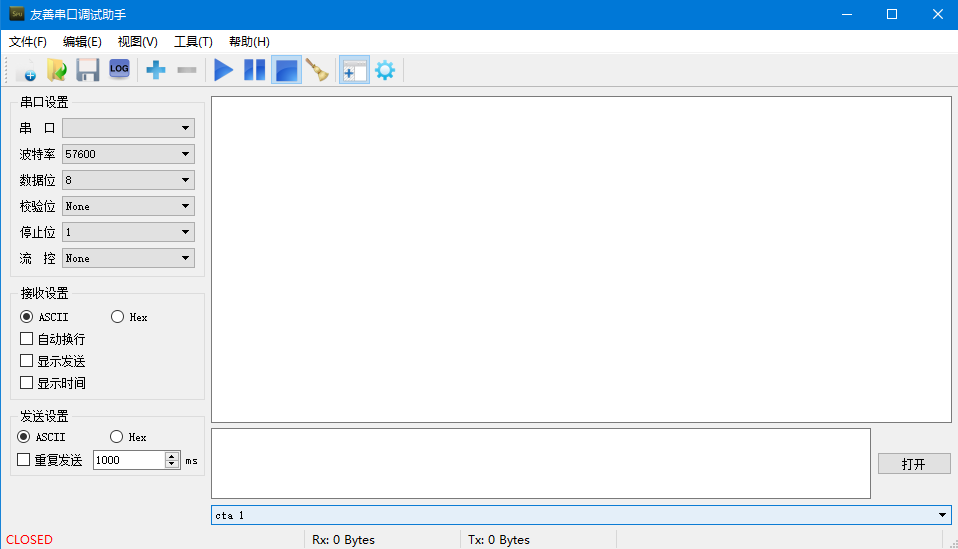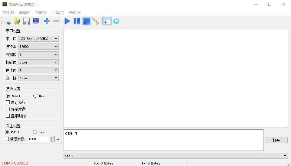 波特率:57600,数据位:8,校验位:None,停止位:1,流控:None,接收设置:ASCII发送设置:ASCII;设置好后串口调试助手界面如图所示。