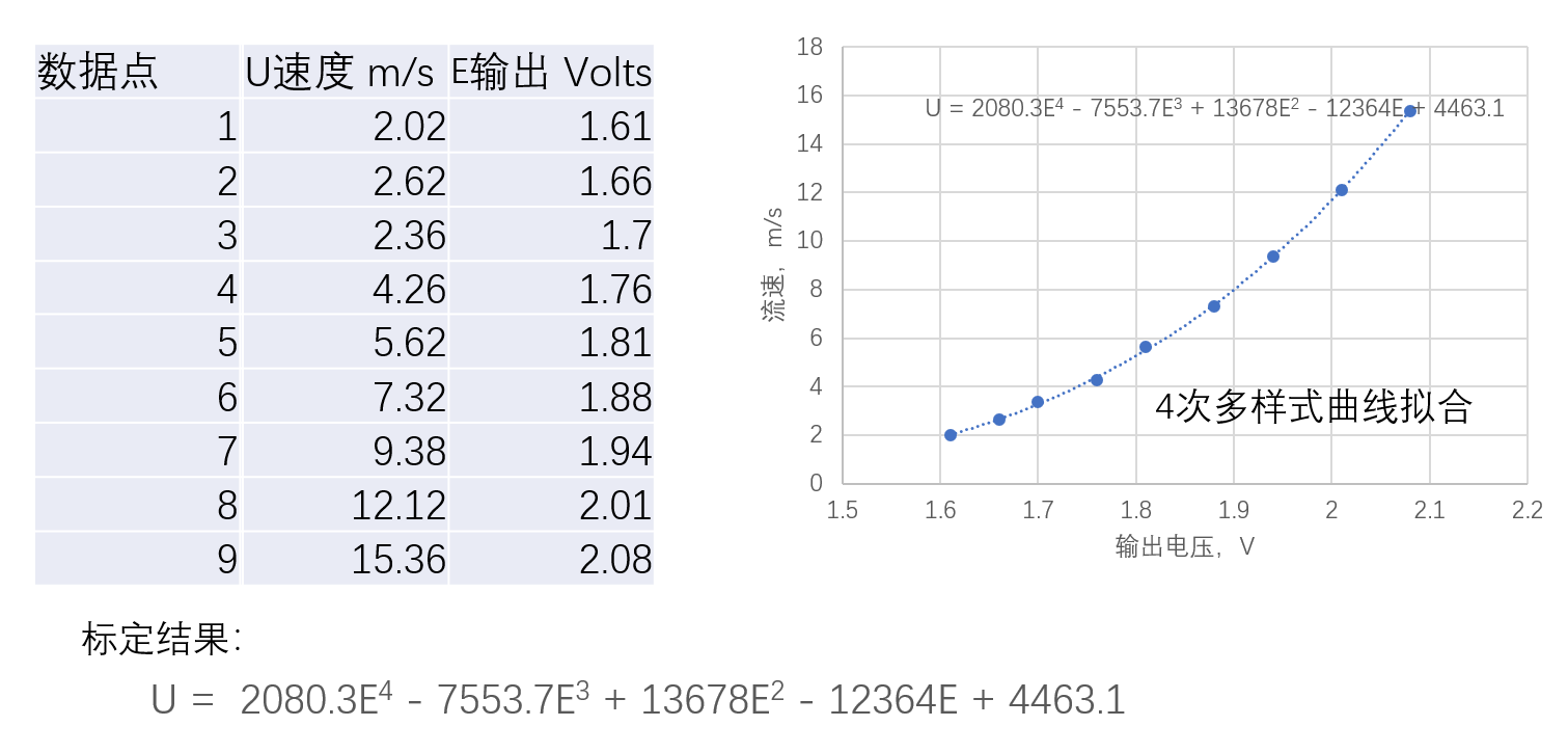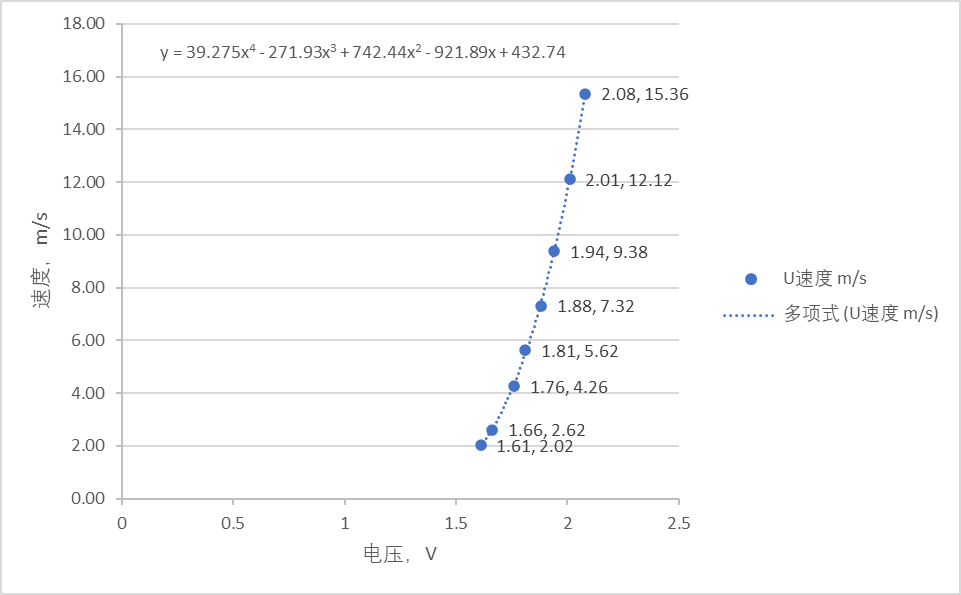在EXCEL或者MATLAB等软件中,使用四阶多项式曲线拟合电压E和流速U的关系;