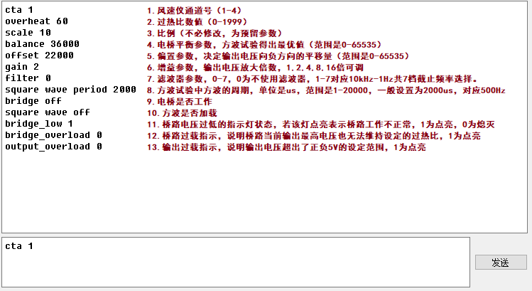 以上命令用于风速仪桥路开关,cta与编号还有编号与bridge_off间均使用空格隔开,探头连线的连接及断开需要在桥路关闭的状态下进行,以防电流冲击对探头造成损坏。