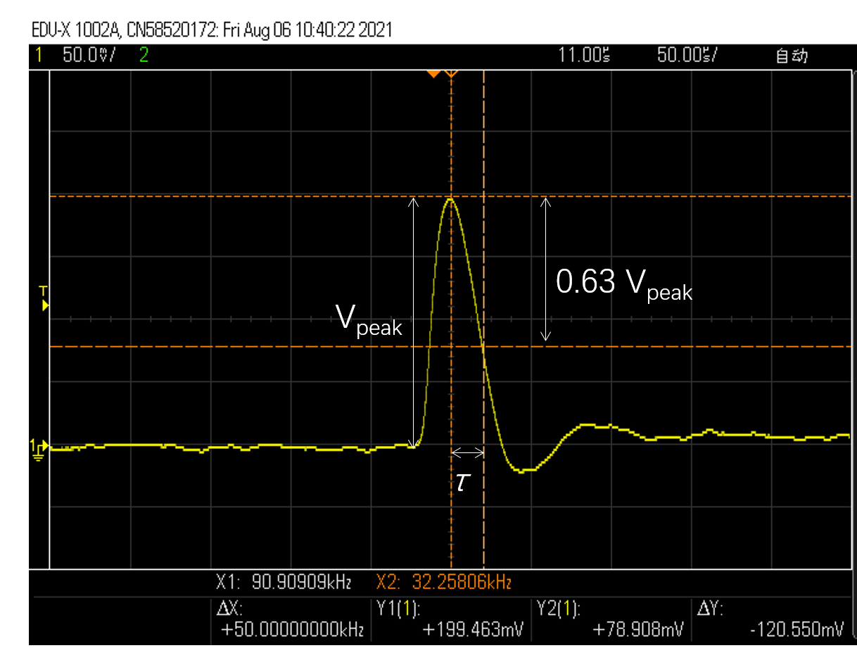 系统的特征响应时间可由方波测量结果确定。具体方法参考Lomas:特征时间τ是方波测试中峰值到峰值63%的时间,特征频率f=1/τ. 下图中特征时间τ为20微秒左右,特征频率则约为50kHz。