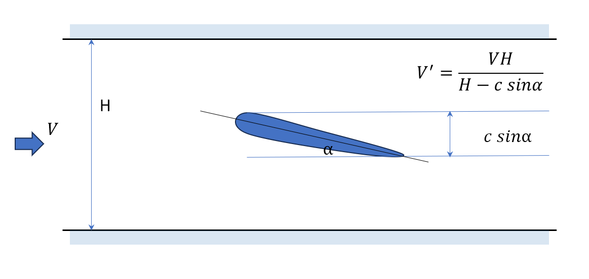 因为模型较大(弦长c=10cm)而风洞实验段截面较小(实验段高H=25cm),当迎角较大时,模型对风洞的阻塞作用变得较大,示意图见图3。忽略该作用对实验结果的影响开始变大。因此建议对流速进行修正,