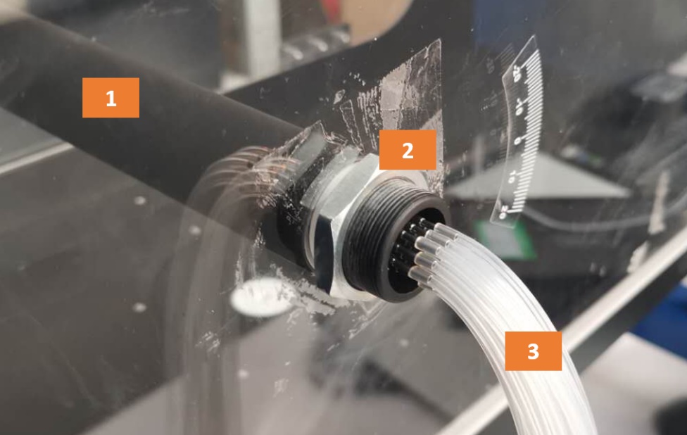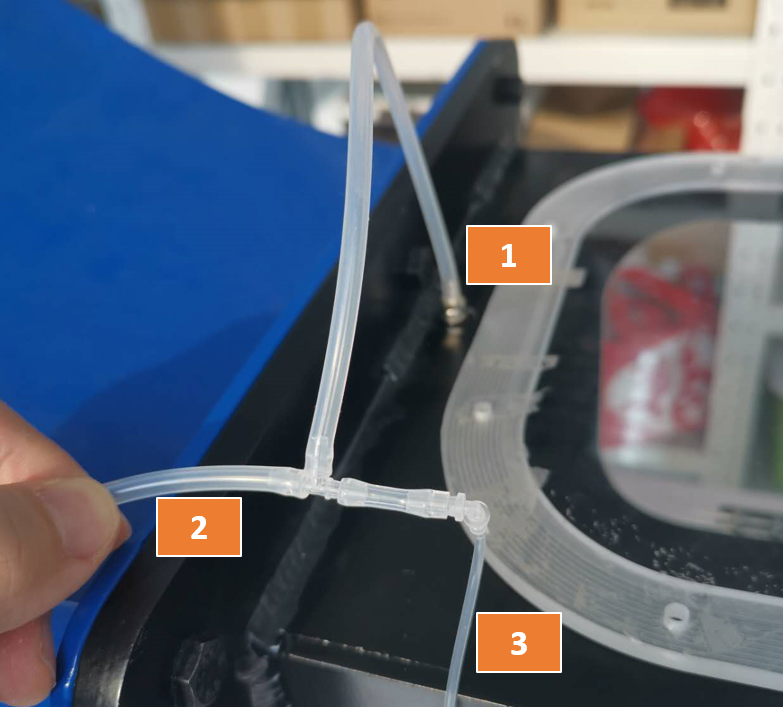 图 13 一个三通把(1)风洞侧壁上的测压管与(2)DAQ16数采仪内压强传感器的L端以及(3)PSU16电子压力扫描阀的参考端Port 0连接起来。