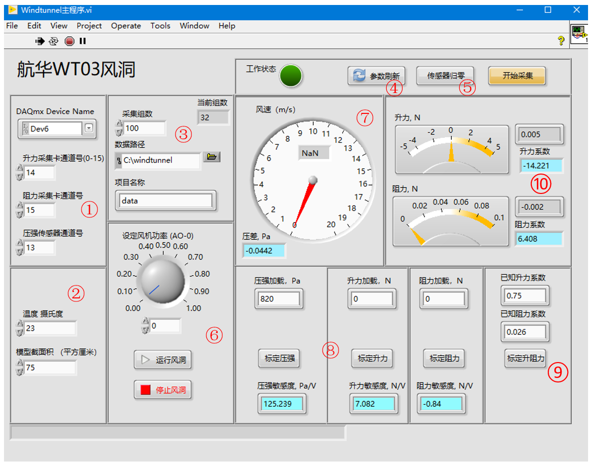在风洞控制软件上设置输出功率为0.2 (附录D),点击 运行风洞,点击 开始采集,记录来流速度,