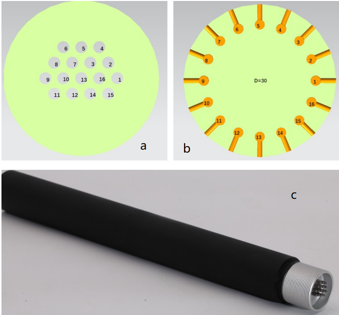本次实验使用航华CM2圆柱模型,照片见图10c。该模型一侧设有螺纹,用于安装模型。该模型长度为L=245mm(黑色部分,不包括螺纹部分),直径为D=30mm。。在圆柱中部(就展向而言的中部)沿轴向相同距离设有16个测压孔,两个相邻测压孔间距24o。测压孔通过内部通道与模型一侧的16个测压管相连。测压管的布置和编号见图10a,每个测压管对应测压孔位置见图10b。
