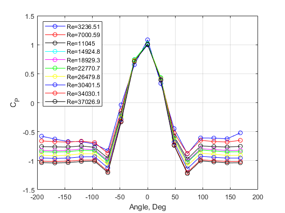利用MATLAB对数据行处理,分析压强系数与雷诺数ReD的关系;