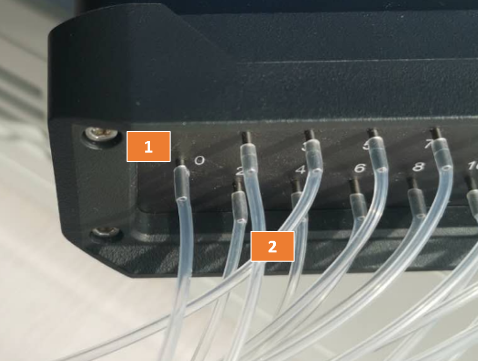 图 12 电子压力扫描阀最左侧(1)Port 0为参考端,(2) 其他16个测压管为测量端。传感器汇报的是16个测点压强与参考端压强的差值